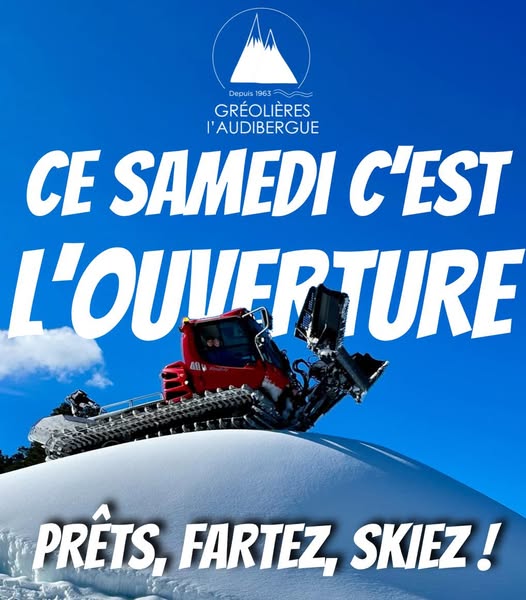 Prêts, Fartez, Skiez ! La communication visuelle de la station montrant une dameuse PistenBully en…